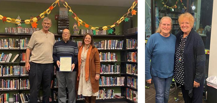 Antoinette Ruta, the new Gill Memorial Library Director, welcomes former Library Director Violet Valentin to the Library for a visit.