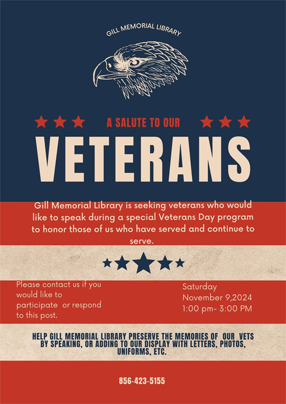 Salute to our Veterans. Gill Memorial Library is seeking veterans who would like to speak during a special Veterans Day program to honor those of us who have served and continue to serve.
